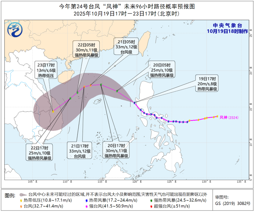 中央气象台将于今天(19日)18:00继续发布台风蓝色预警和大风黄色预警。台风蓝色预警:第24号台风“风神”(热带风暴级)中心今天(19日)下午5点位于菲律宾吕宋岛西海岸。中心附近最大风力为8级(20米/秒),中心最低气压为995 hPa,7级风圈半径为150-180公里。预计“风神”将以每小时25-30公里的速度向西北方向移动,强度将逐渐增强。最强可达严重热带风暴级或台风级(30-35米/秒,11-12级)。 21日白天,将受南方冷空气影响。它将在南海中北部转向西南方向向越南中部海湾移动,强度将逐渐减弱。黄色警告预计10月19日20:00至10月20日20:00,新疆北部和东部、内蒙古西部和东部、黑龙江东部、吉林东部、甘肃河西、山东半岛、江苏南部、安徽南部、江西等地的部分地区有5~6级风,阵风6级;东海西部海域、台湾海峡、南海中东部东北部和北部海域将有9~10级、阵风11~12级大风。黄海大部、东海北部海域、巴士海峡、南海西北部和中西部海域、北部湾将有7~8级、阵风9级大风。 10月20日20:00至10月21日20:00,新疆北部和东部、甘肃河西、西藏西部和北部、青海南部、内蒙古西部和东部、江苏南部、安徽南部、北部浙江、江西北部、广东南部、西南等部分地区阵风7~8级;东海西南海域、台湾海峡、台湾以东部分海域、南海北部、中西部地区北部海域将有9~10级、阵风11~12级大风。黄海中南部海域、东海北部海域、台湾东部海域、北部湾将有7~8级、阵风9级大风。南方网广东考察记者 余彦斌