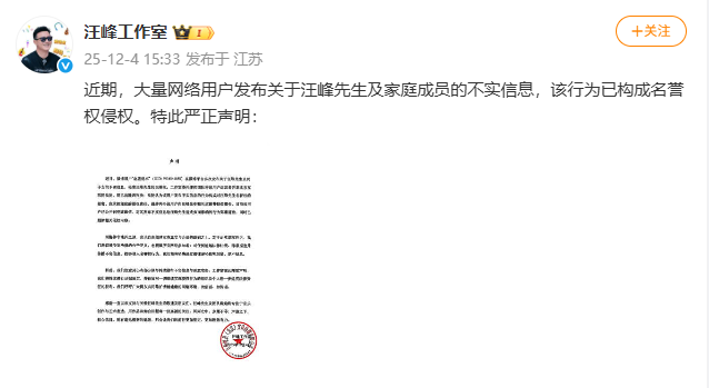 12月4日,@王峰工作室发布严正声明:近期,大量网友发布有关王峰先生及其家人的虚假信息。这种行为构成了对名誉权的侵犯。声明指出,微博用户“赵赵说事”(UID:5934541885)多次在微博平台发布有关王峰先生及其子女的虚假信息,侵犯了王峰先生的名誉。工作室委托律师团队向北京互联网法院起诉该用户,并作出胜诉判决:法院认为,该用户发布虚假信息的行为构成对王峰先生名誉权的侵犯,应承担相应的侵权责任。最后指示用户要求向王峰先生道歉并赔偿损失。目前,该用户已公开发表道歉信,对自己发布虚假信息的行为表示真诚的歉意。因给王峰先生造成负面影响,已删除相关侵权内容。 12月3日晚,@赵羾说事发布道歉信,表示经过深入调查,认识到自己的行为是极其错误和不负责任的。