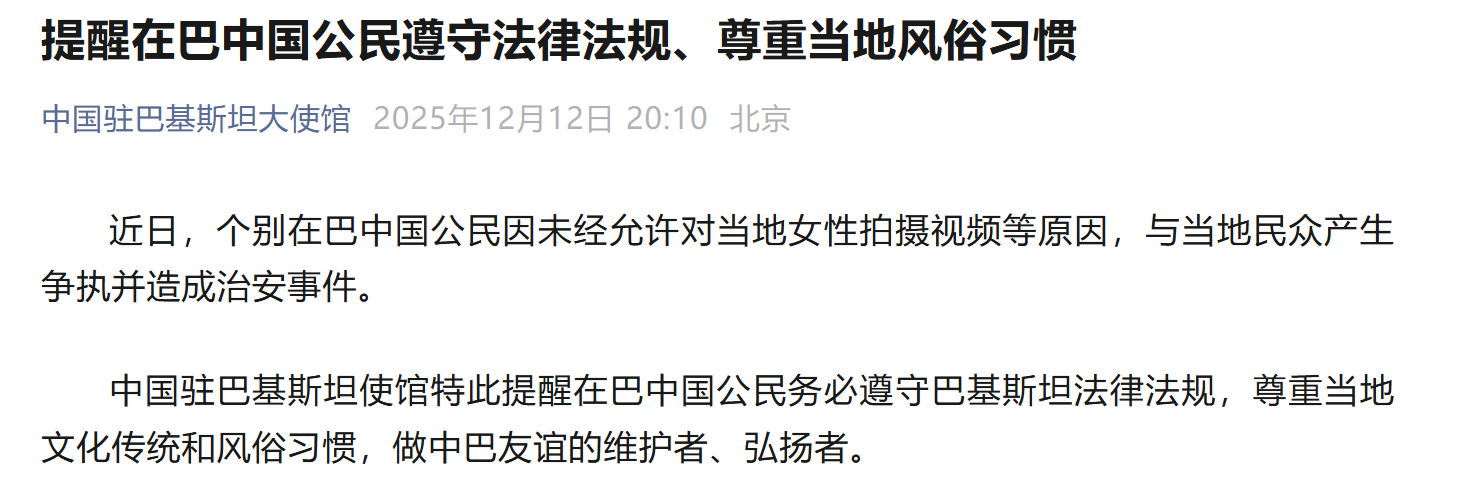 您现在的位置是:主页 > 十大买球软件 > 未经允许拍摄女性引发误解和冲突,提醒在巴中 发布时间:2025-12-13 09:41编辑:365bet登录浏览(124) 据中国驻巴基斯坦大使馆消息,近期,个别在巴中国公民因擅自拍摄当地妇女视频等原因,与当地民众发生纠纷,引发安全事件。中国驻巴基斯坦使馆提醒在巴中国公民遵守巴基斯坦法律法规,尊重当地文化传统和习俗,做中巴友谊的维护者和促进者。 上一篇:“最守法五国”将出现在光伏项目名单中?河南 下一篇:没有了 相关文章 “最守法五国”将出现在光伏项目名单中?河南 警方通报,有人利用AI生成“小鹏车展烂视频”! 温泉酒店更衣室疑似偷拍?警方通报:2人已被拘 苟仲文受贿逾2.36亿元被首次判处死刑缓期执行 贝宁部分士兵发动政变,总统府称已控制局势